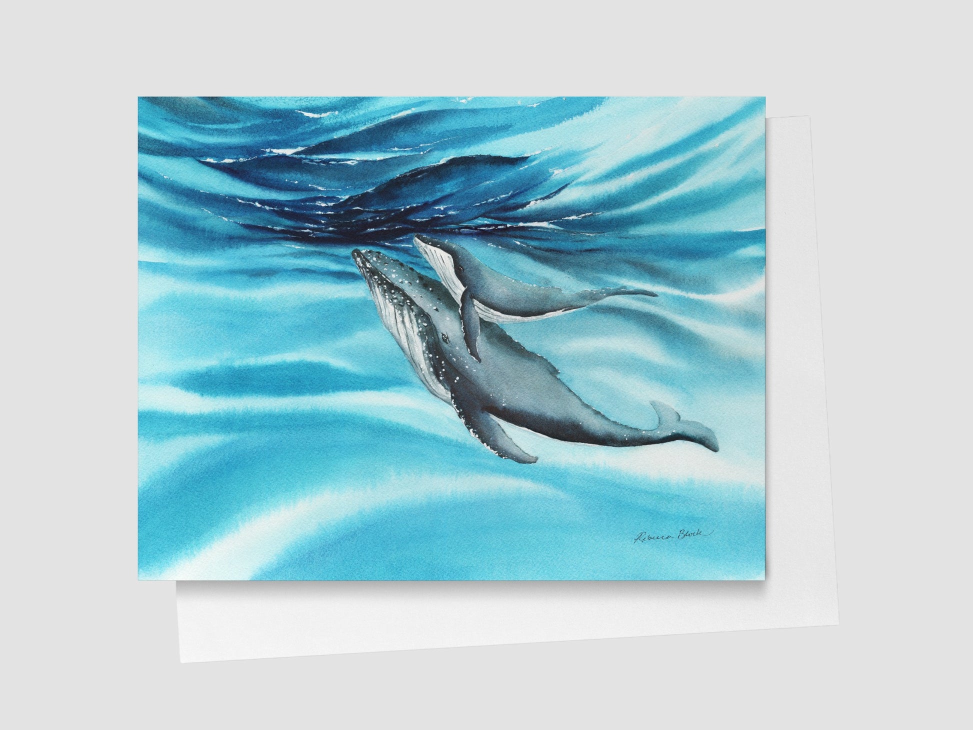 Spread joy and connection to family and friends with this cheerful Humpback Whales greeting card! Measuring a perfect 4.25" x 5.5", this card is a miniature work of art, designed to carry your heartfelt messages.